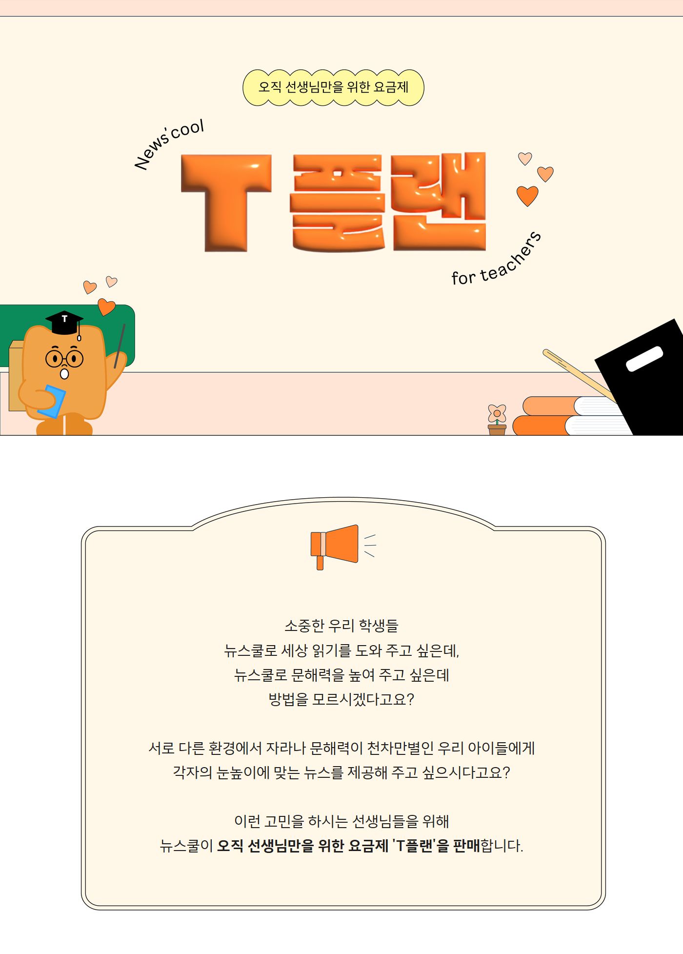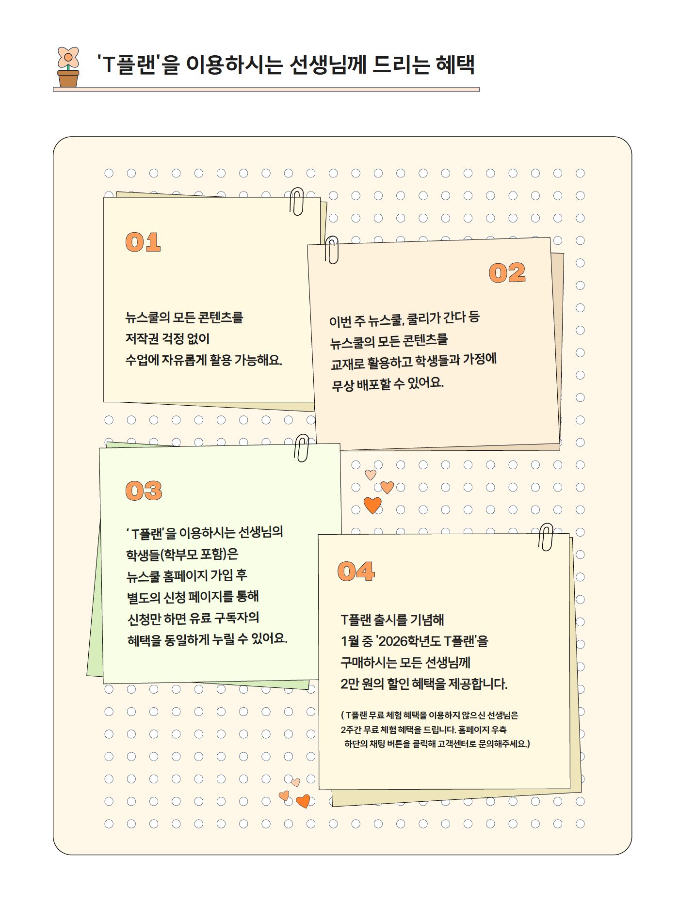 기타 2026학년도 T플랜을 출시합니다 T플랜은 학교, 지역아동센터에서 다수의 학생들을 지도하시는 선생님을 위한 요금제입니다. 무료 체험을 원하는 선생님께서는 고객센터를 통해 '2주 무료 체험 혜택'을 신청해 주세요. 단, 기존에 무료 체험을 이용하신 선생님께서는 신청하실 수 없습니다. 뉴스쿨 콘텐츠 가이드고객센터 문의하기