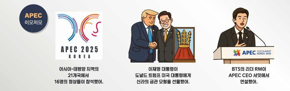 지난 10월 29일, 미국의 도널드 트럼프 대통령이 한국을 찾았습니다. 공항에 도착한 트럼프 대통령이 향한 곳은 서울이 아닌 신라 천 년의 역사를 품은 고도 '경주'입니다. 트럼프 대통령뿐이 아닙니다. 중국, 일본 등 세계 여러 나라의 지도자들이 경주에 모였습니다. 이들이 경주에 온 이유는 아시아·태평양경제협력체(APEC) 정상회의에 참석하기 위해서입니다. APEC 정상회의는 아시아와 태평양 주변 여러 나라들이 모여 정치와 경제 문제를 이야기 하는 협의체인데요. 이를 계기로 미국, 중국, 일본 등 21개 회원국의 정상급 인사 16명과 약 1700여 명의 세계적 기업 CEO들이 한국을 찾았습니다.