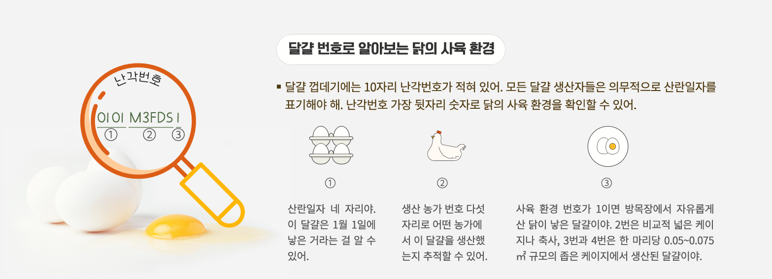 이런 변화는 '동물도 행복해야 인간도 건강하다'고 믿는 사람들이 점점 더 많아지고 있기 때문이래. 케이지 속 닭은 스트레스가 쌓여 면역력이 약하고, 쉽게 병에 걸려. 그래서 이런 농장에선 전염병을 예방하려고 항생제나 살충제를 많이 사용해. 그 성분은 고스란히 달걀에도 남겠지. 이런 달걀을 원치 않는 사람들이 많아지면서 판매점에서는 동물복지를 지키는 농장에서 생산한 달걀, 넓은 공간에서 생활한 닭이 낳은 알을 따로 표시해서 판다고 해.
