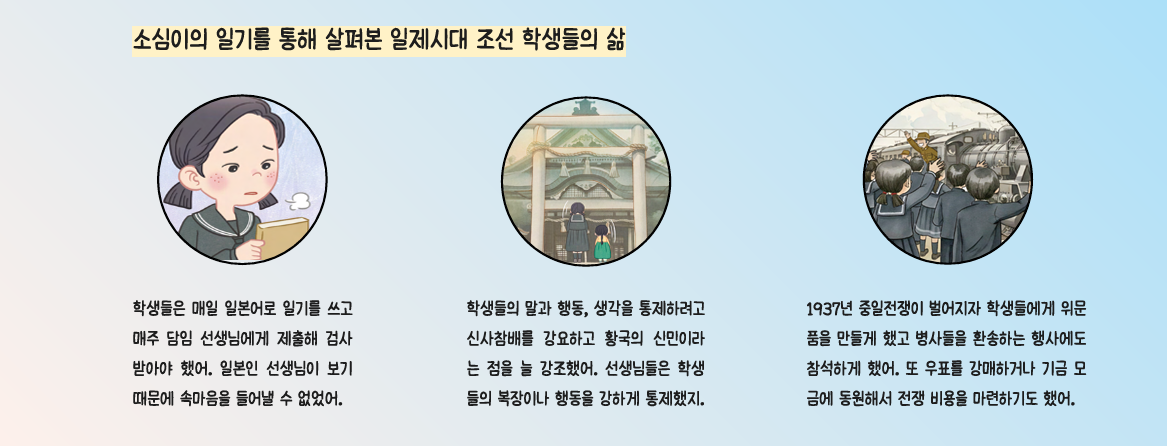 하지만 소심이는 종종 깊은 절망을 느낍니다. 그의 학교생활은 오늘날 우리가 알고 있는 여학생의 모습과는 크게 다르기 때문입니다. 학교에선 엄격한 규율로 조선인 학생들을 통제하고 조선어를 사용할 수 없게 합니다. 친구들끼리도 말을 조심해야 합니다. 조카의 손을 잡고 대구 신사에 억지로 가야 할 때면 마음이 무거워집니다. 어린 조카에게 왜 일본의 신을 향해 절을 해야 하는지 설명하지 못한 채, 속으로만 답답함을 삼킵니다. 겉으로는 아무 일 없는 듯 고개를 숙이지만, 일기장 속에는 복잡한 마음이 고스란히 담깁니다.