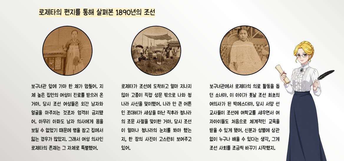 로제타는 1865년 미국에서 태어나 세계 최초의 여자 의과대학인 펜실베이니아 여자의과대학을 졸업한 의사이자 선교사입니다. 당시 미국과 유럽의 기독교 선교단체들은 아시아 곳곳에 선교사를 파견하고 있었습니다. 1882년 '조미수호통상조약'이 체결된 이후 조선에도 본격적으로 기독교 선교사들이 들어왔고 이들은 근대식 병원과 학교를 세우기 시작했습니다. 아픈 사람들을 치료하고, 배움의 기회를 얻지 못했던 이들에게 글과 지식을 가르치며 종교도 함께 전파한 것입니다.