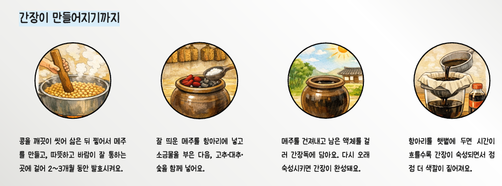 전통 간장은 어떨까요. 과거 우리 민족은 해마다 겨울이 되면 장을 담갔습니다. 마당 한쪽 장독대에 항아리가 줄지어 놓이고, 찬물에 메주를 씻으며 온 가족이 함께 한 해의 밥상을 책임질 장을 준비했습니다. 장은 보통 겨울, 특히 2월 무렵에 담갔는데요. 낮은 기온이 잡균의 번식을 억제하고 발효가 지나치게 빨라지는 것을 막아, 장이 천천히 익도록 돕기 때문입니다. 장을 담근 뒤에는 짧게는 수개월, 길게는 1년 이상 숙성 과정을 거쳤습니다. 이 시간 동안 메주 속 단백질과 전분이 미생물에 의해 분해되며 간장 특유의 감칠맛과 향이 만들어집니다. 숙성은 맛을 깊게 할 뿐 아니라, 자극적인 성분을 줄여 장을 보다 안전한 먹거리로 만드는 과정이기도 했습니다.