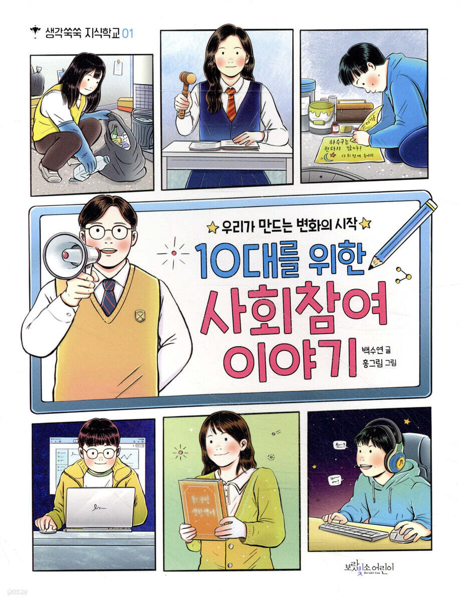 사회에 참여하는 방법은 다양해. 단지 투표를 하거나 정치적 목소리를 내는 것뿐만 아니라 불편한 것들을 바꾸기 위한 작은 움직임을 실천하는 것만으로도 세상을 더 좋게 만들 수 있지. 이 책은 10대라는 어린 나이에도 불구하고 발명, 창업, 자원봉사 같은 방법으로 사회에 참여한 일곱 친구의 이야기를 담고 있어. 이들은 우리나라 최초로 코로나19 정보 제공 앱을 개발해 혼란을 잠재우기도 했고 자퇴생을 향한 편견과 차별에 맞서 싸우기도 했지. 또 콘텐츠를 만드는 청소년 크리에이터들을 돕기 위해 창업을 한 친구도 있어. 10대들이 이런 일을 해냈다니, 정말 놀랍지? 실제로 세상에는 정말 멋진 10대들이 많아. 이들이 일으킨, 작지만 큰 변화를 살펴보며 나는 어떤 일을 할 수 있을지 고민해 보자.