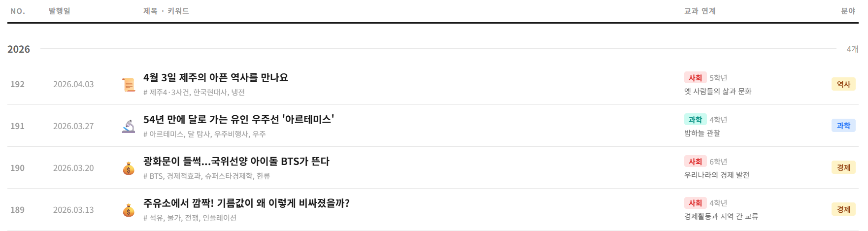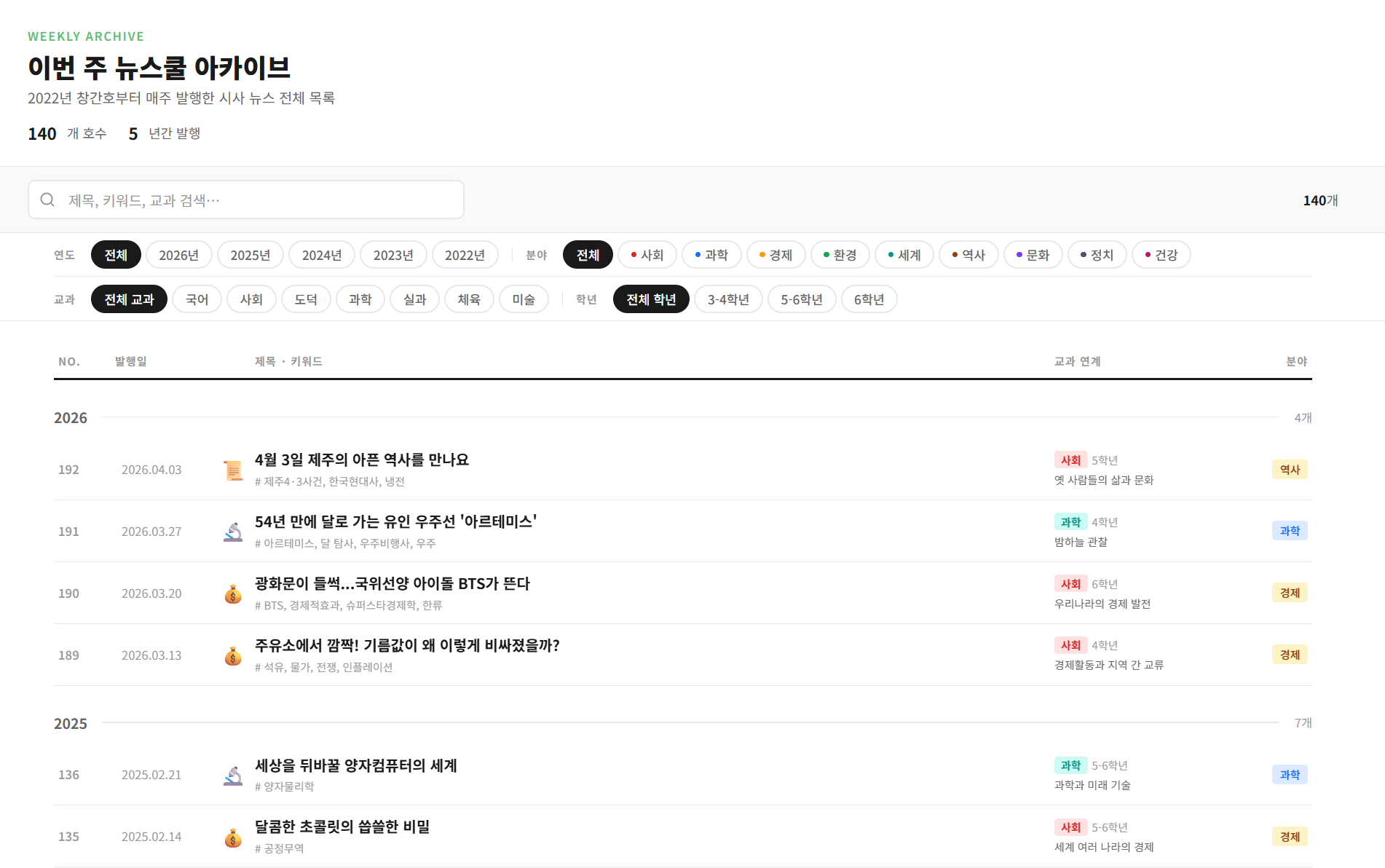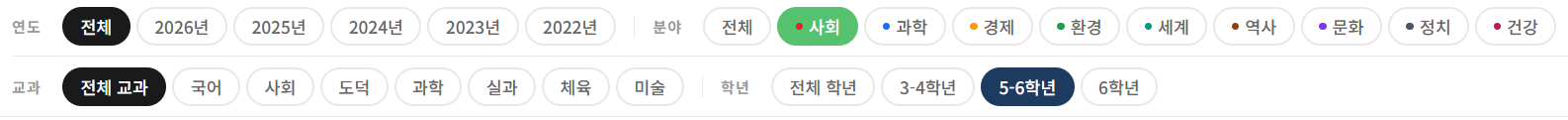 연도별, 분야별(사회·과학·경제·환경 등) 필터는 물론, 교과목과 학년으로도 걸러볼 수 있어요.