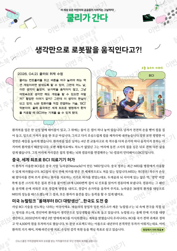 쿨리는 게임을 엄청 좋아해. 특히 컨트롤러를 쥐고 버튼을 마구 눌러야 하는 액션 게임이라면 밤새도록 할 수 있지. 그런데 어느 날, 쿨리는 이런 생각을 했어. '손가락을 움직이지 않고, 그냥 머릿속으로 생각만 해도 게임 캐릭터가 움직이면 어떨까?' 황당한 이야기 같지? 그런데 이 생각이 현실이 되고 있대. 뇌와 컴퓨터를 직접 연결하는 기술, 'BCI' 덕분이야. 올해 중국에선 세계 최초로 병원에서 환자를 치료할 때 BCI라는 기계를 쓸 수 있게 됐대. 이 기계가 뭐길래 생각만으로 기계를 움직일 수 있게 도와준다는 건지, 쿨리가 알아봤어.