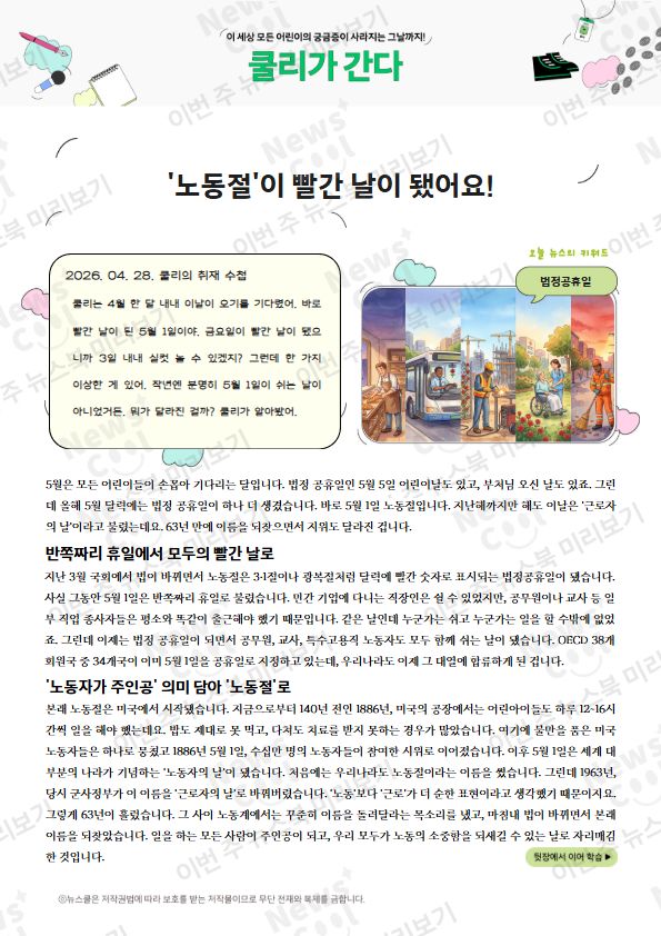 디지털북 [쿨리가 간다] 63년 만에 되찾은 이름, '노동절'이 빨간 날이 됐어요! 쿨리는 4월 한 달 내내 이날이 오기를 기다렸어. 바로 빨간 날이 된 5월 1일이야. 금요일이 빨간 날이 됐으니까 3일 내내 실컷 놀 수 있겠지? 그런데 한 가지 이상한 게 있어. 작년엔 분명히 5월 1일이 쉬는 날이 아니었거든. 뭐가 달라진 걸까? 쿨리가 알아봤어.