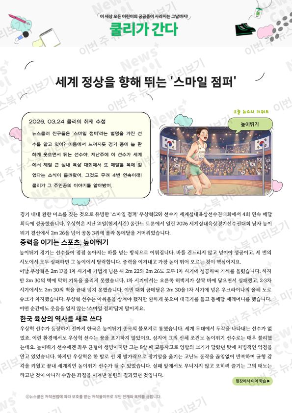 디지털북 [쿨리가 간다]세계 정상을 향해 뛰는 '스마일 점퍼' 뉴스쿨러 친구들은 '스마일 점퍼'라는 별명을 가진 선수를 알고 있어? 이름에서 느껴지듯 경기 중에 늘 환하게 웃으면서 뛰는 선수야. 지난주에 이 선수가 세계에서 제일 큰 실내 육상 대회에서 또 메달을 목에 걸었다는 소식이 들려왔어. 그것도 무려 4번 연속이래! 쿨리가 그 주인공의 이야기를 알아봤어.