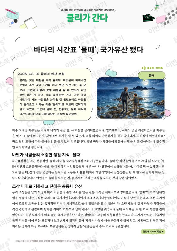 쿨리는 갯벌 체험을 무척 좋아해. 바닷물이 빠져나간 갯벌에 주저 앉아 조개를 캐다 보면 시간 가는 줄 모르지. 그런데 이렇게 갯벌 체험을 할 때 반드시 확인해야 하는 게 있어. 바로 '물때'라는 거야. 아주 옛날 바닷가에 사는 사람들은 과학을 잘 몰랐는데도 바닷물이 들어오고 나가는 때를 '물때'라고 부르며 정확하게 알고 있었대. 그런데 얼마 전, 전통적인 물때 지식이 국가무형유산으로 지정됐다는 소식이 들려왔어. 밀물과 썰물의 시간을 읽는 게 왜 국가유산이 된 걸까? 쿨리가 알아봤어.